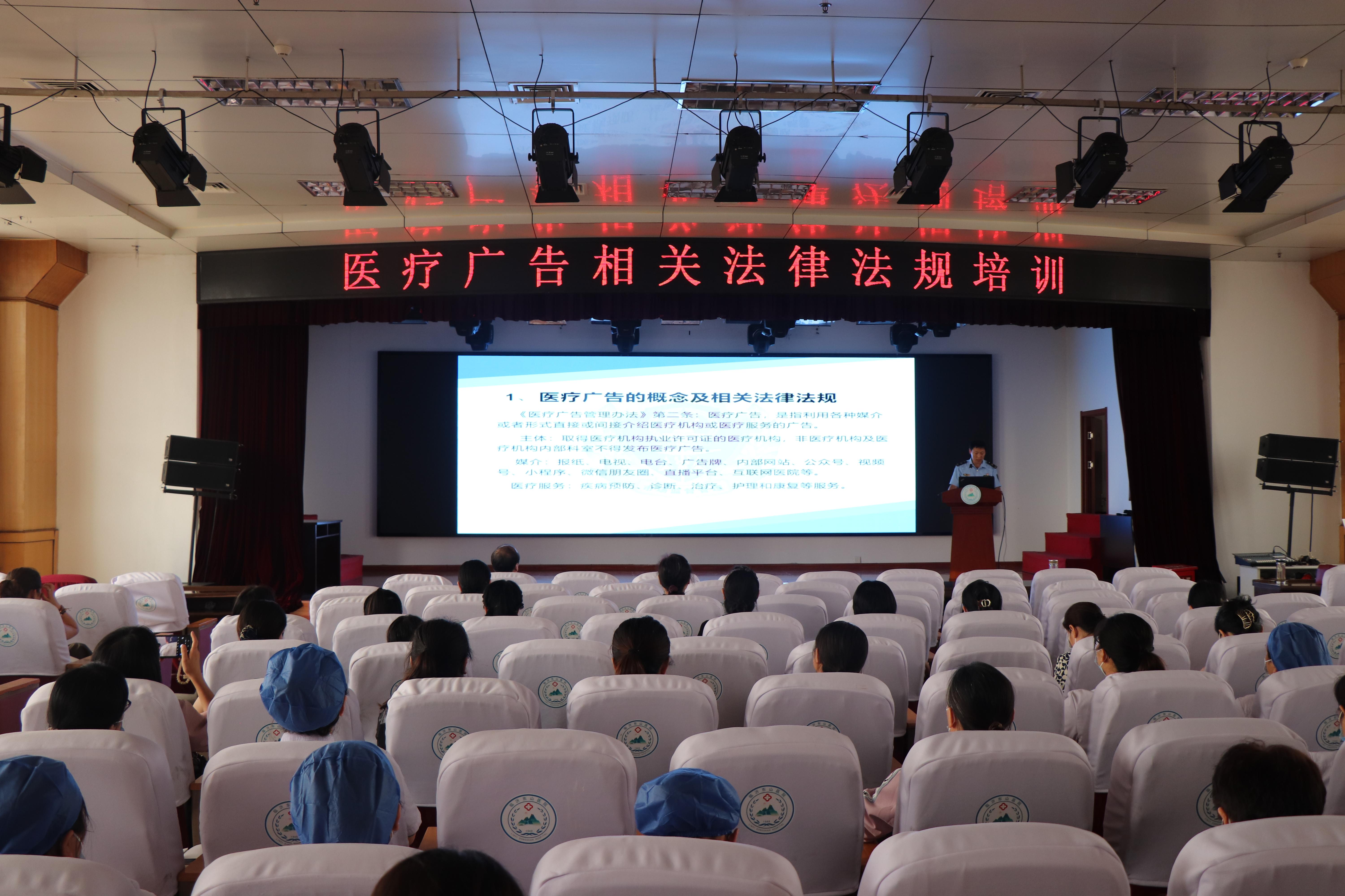 本次活动立足临沂东山医院的发展动态和诉求,首先由市市场合同和广告网络执法科副科长薛文博同志围绕医疗广告进行普法宣讲,宣讲从医疗广告的概念及相关法律法规入题,通过实例演示了常见的违法医疗广告,让大家对违法医疗广告有了直观的认知,并“以案释法”,讲述了发布违法医疗广告的危害及法律后果。最后,就如何正确发布医疗广告进行了讲解。